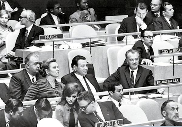 «Все пять лет работы в ООН мне пришлось вести вопросы Четвёртого Комитета (проблемы деколонизации) и Специального Политического Комитета (обстановка на Ближнем Востоке). Так что я в какой-то степени стал специалистом по проблеме предоставления независимости колониальным странам. Приходилось часто выступать в поддержку народов, борющихся за своё освобождение, критиковать Англию, Францию, Бельгию, США, которые всеми силами тормозили предоставление независимости территориям, где господствовали веками. В 1970 году белорусское правительство решило выдвинуть кандидатуру нашей республики на избрание непостоянным членом Совета Безопасности ООН. За всю мою дипломатическую работу это было самое сложное поручение – на его выполнение ушло целых четыре года. Мне нужно было убедить Джорджа Буша старшего, который в то время был послом США при ООН, что БССР должна стать членом совета безопасности. Встреча состоялась в американской миссии. Буш внимательно меня выслушал, а потом спросил: «Зачем БССР быть членом Совета Безопасности, когда ваши интересы там представляет Советских Союз?» Пришлось мне прочитать американскому послу лекцию минут на сорок, в том числе напомнить, что БССР в своё время стало членом-основателем ООН. Кстати, это было моё первое, но не последнее столкновение в стенах ООН с Джорджем Бушем, который впоследствии стал послом США в Китае, затем директором Центрального разведывательного управления и, наконец, президентом Соединённых Штатов».