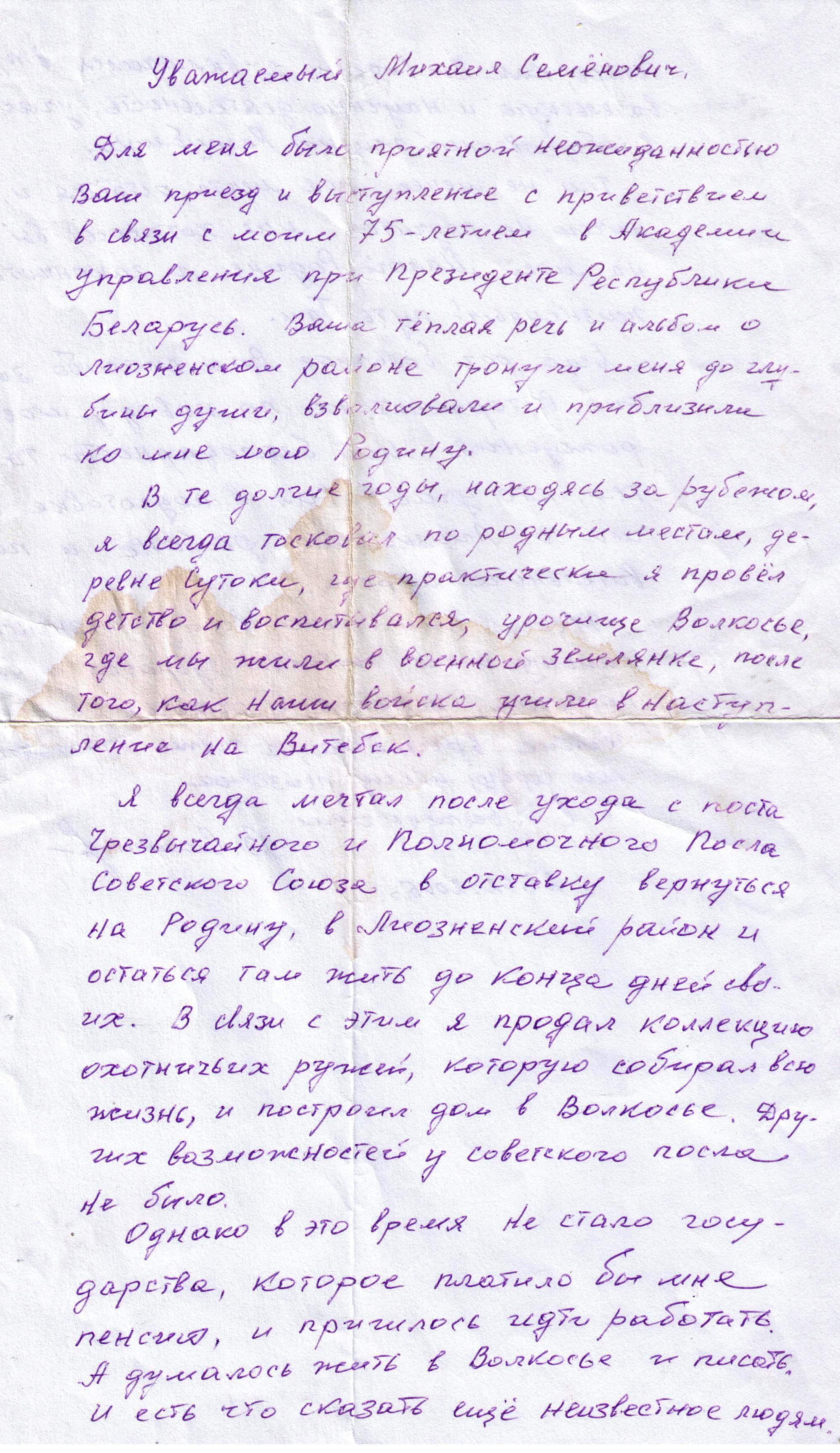 «Когда ещё были в Сутоках, мне и ещё одному мальчику из нашей деревни, Алесю Комиссарову, было поручено собирать оружие, патроны, бутылки с зажигательной смесью, гранаты. Начиная с лета и до конца зимы, мы собрали их большое количество. Винтовки и автоматы тайком переносили в дом Комиссаровых, глава семьи которых возглавлял здесь борьбу против оккупантов. Иногда я следил за дорогой, идущей в деревню из Лиозно, а при появлении полицейских или немцев срочно сообщал Алесю. Весной 1942 года мы вынуждены были уйти из деревни. Я, совсем мальчишка, попал в Красную Армию, был её воспитанником. Оказался в Понизовье – небольшом районном центре в Смоленской области на берегу реки Каспля. Был в роте конной разведки. У всех бойцов имелись свои лошади, на которых они отправлялись на задания, а для меня такого боевого коня не нашлось. Предложили старую больную Лыску. Я её вылечил.