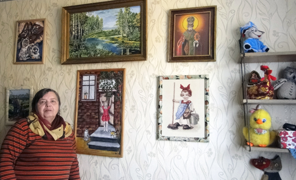 Мая субяседніца расказала, што ў яе з самага дзяцінства праявілася цяга да мастацтва, без якога цяпер яна не ўяўляе свайго жыцця. Мяне надзвычай уразіла кватэра жанчыны, якая нагадвае выставачную залу. У прыхожай сустракае вышыты бісерам прыгожы анёлак з пранікнёнымі вачыма. На сценах – краявіды дабрамыслінскага краю, копіі знакамітых мастакоў-перасоўшчыкаў, розныя нацюрморты, напісаныя і вышываныя. На канапах, сталах, табурэтках – самавязаныя сурвэткі. Таршэр упрыгожаны вышыўкай. Арыгінальная шытая шафа з кішэнямі, у якіх шапкі, парасон, розныя прылады, якія заўсёды павінны быць пад рукою. Нават, шпалеры жанчына паклеіла незвычайна, па-свойму.